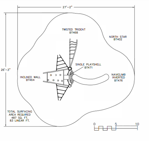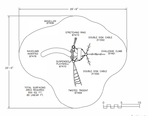 BigToysSpecification: Age Groups: 5-12 years Use Zone: 23’1” x 27’4” Fall Height: 8’ Activities: 5 Capacity: 10-12 Weight: 643 lbs Accessibi...